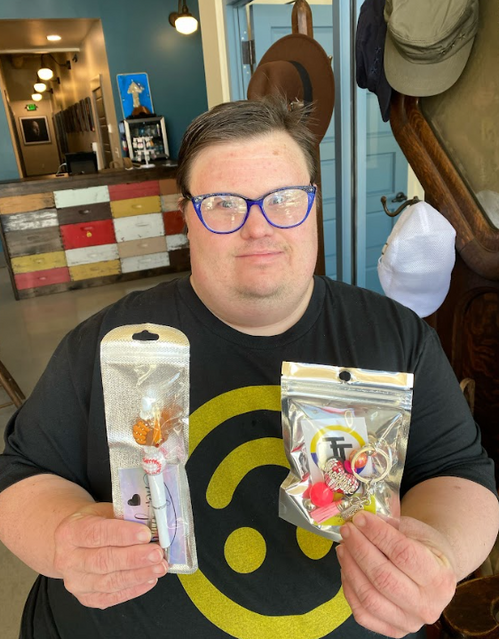 Inspired by a friend’s beaded pens, Tony started his own business, Tony’s Toppers. He now creates beaded pens and wine stoppers, all made with love.